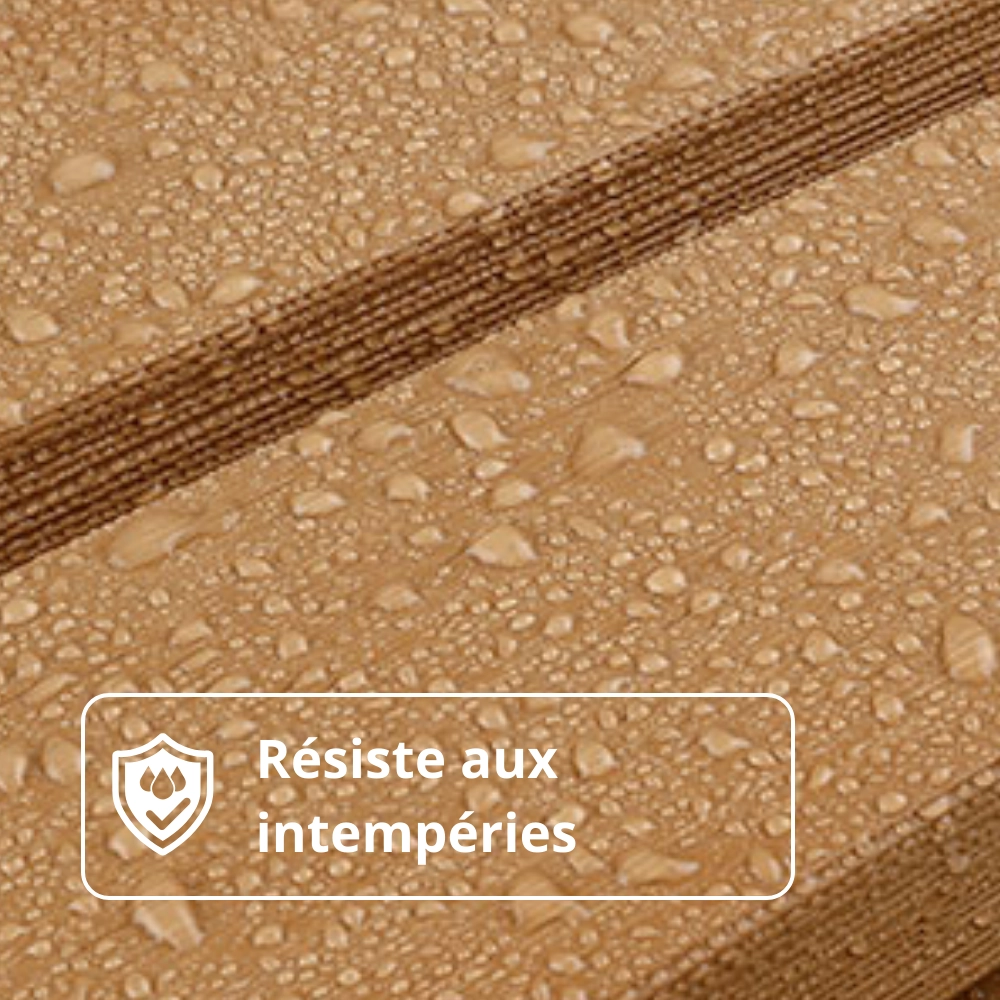 Résistant aux UV, aux intempéries et aux taches, il s’installe aussi bien en pose horizontale qu’en pose verticale. Les fixations restent discrètes grâce au système en fond d’onde, et l’entretien est réduit au minimum : un simple rinçage à l’eau suffit.