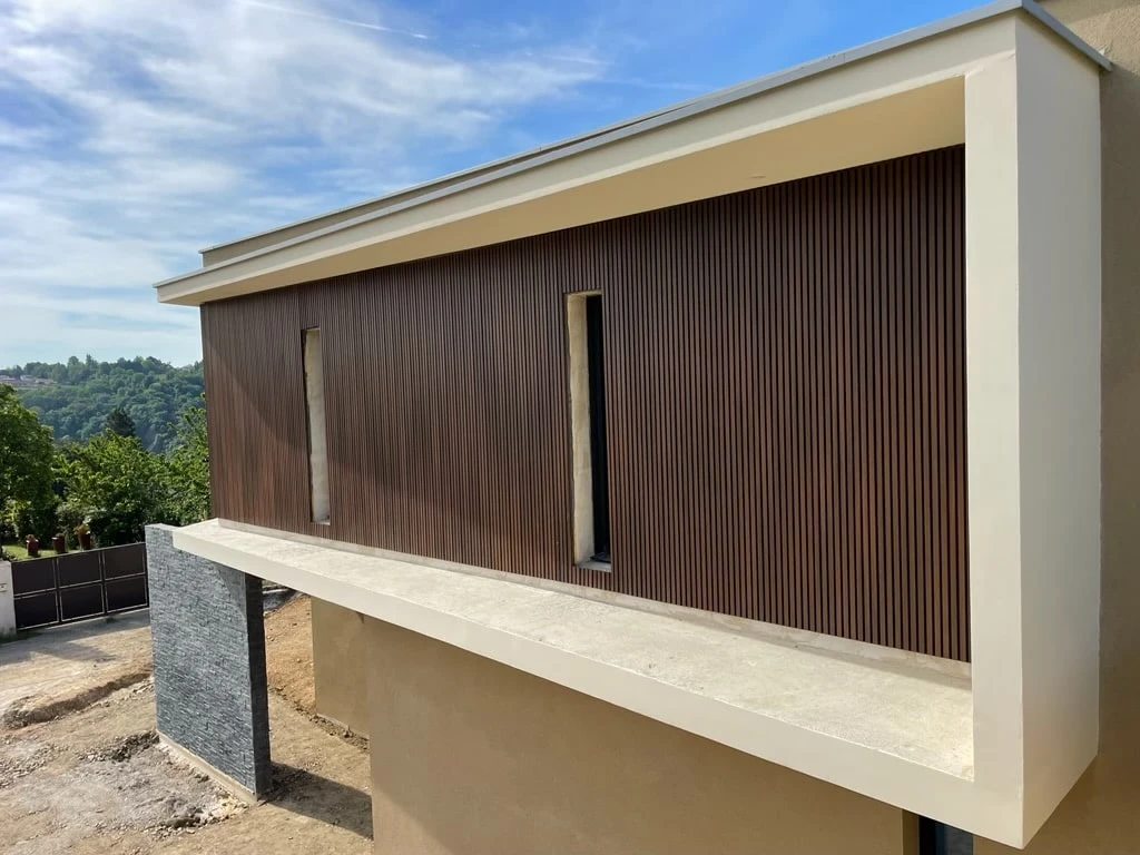 WEO® 35 reprend l’esthétique d’un claire-voie bois avec son profil trapézoïdal et un relief qui capte la lumière, tout en offrant la régularité d’un composite co-extrudé. La surface protégée résiste aux UV, aux intempéries et au gel-dégel ; le profil alvéolaire léger et résistant facilite la pose horizontale ou verticale avec fixation discrète. Le parement ne nécessite aucun entretien, ne pourrit pas et tient dans le temps, idéal pour des façades contemporaines en neuf comme en rénovation.