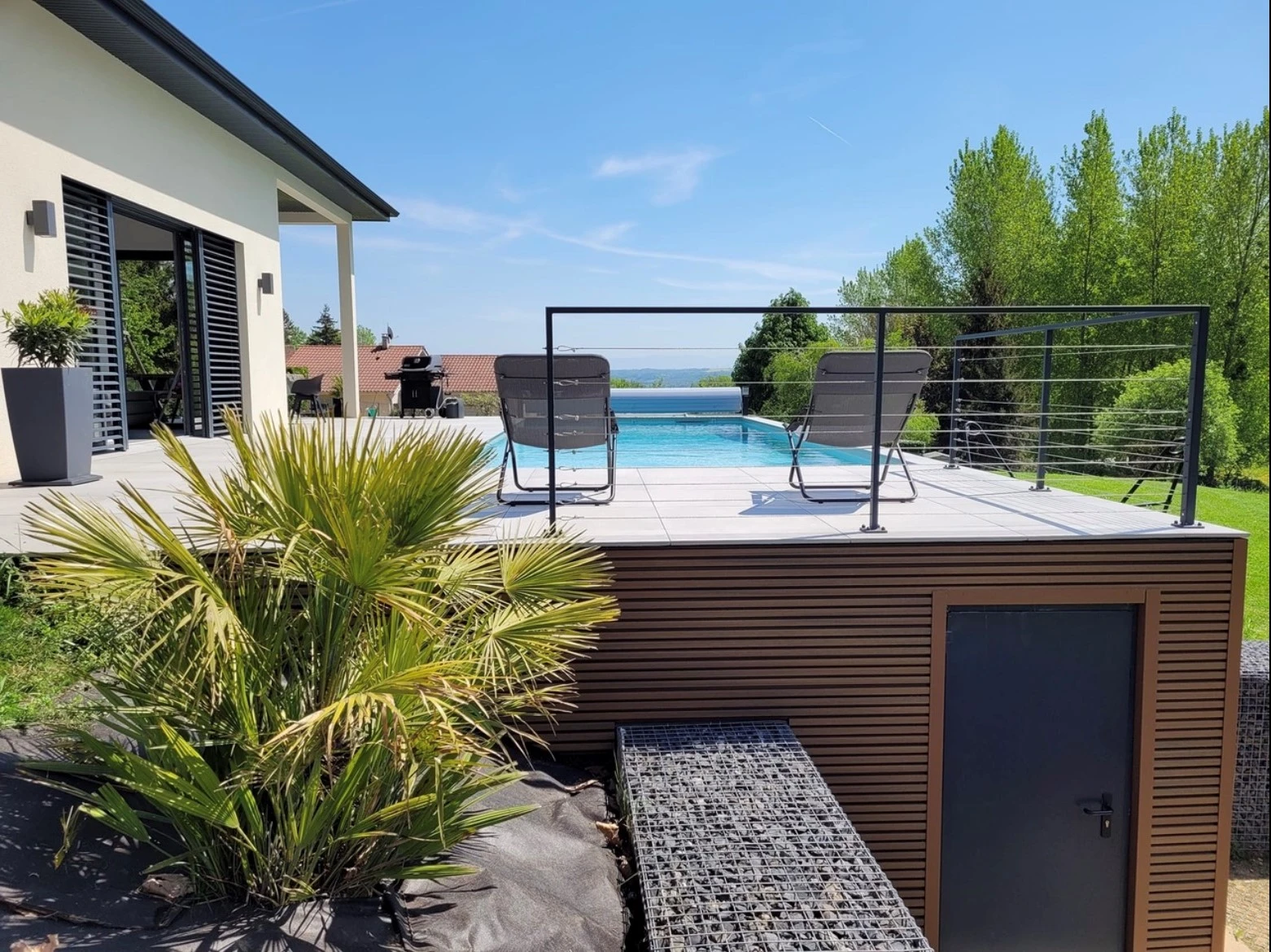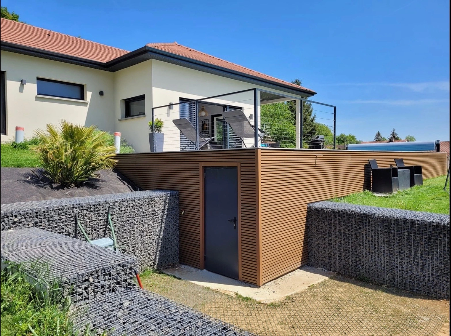 Le soubassement de la piscine semi-enterrée a été habillé en bardage WEO 35 Teak posé à l’horizontale, un matériau parfaitement adapté à la proximité de l’eau, du sel et du chlore.