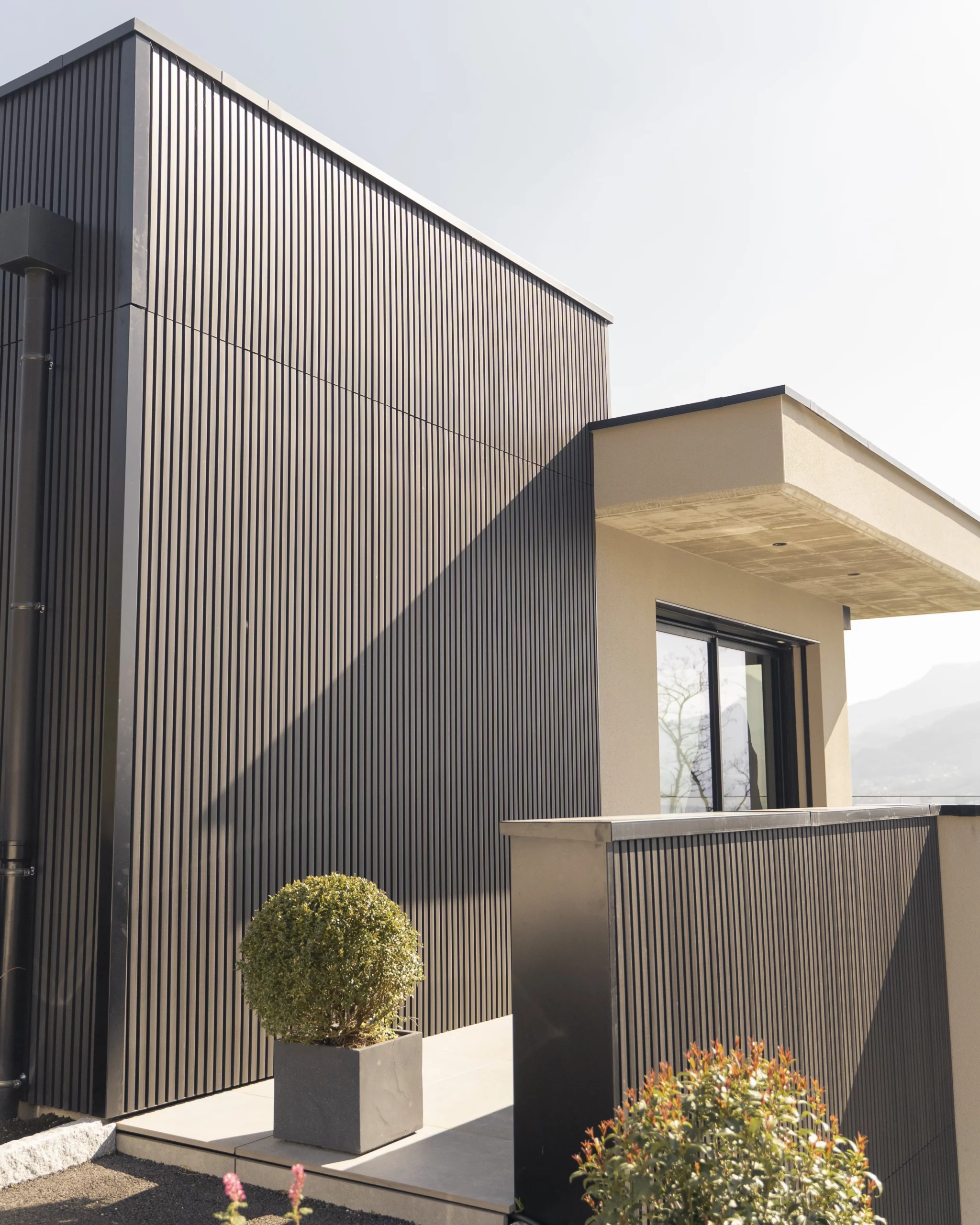 Ce matériau sans entretien s’intègre parfaitement dans le paysage et souligne le style épuré de la maison.