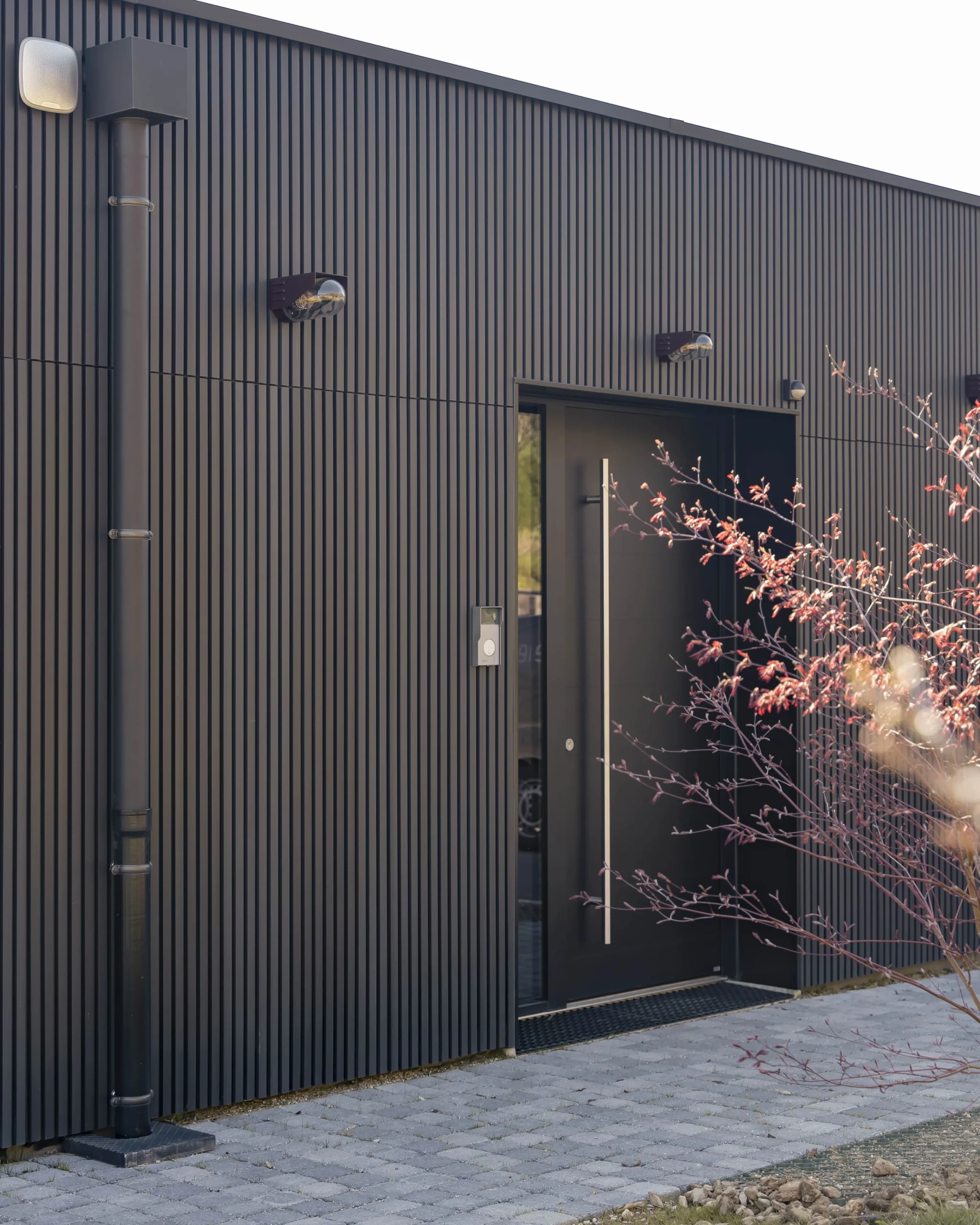 Le bardage composite WEO 35 Dark Grey a été choisi pour habiller les façades, apportant une touche moderne et élégante. Sa pose verticale accentue les lignes du bâtiment et met en valeur le contraste entre les volumes.